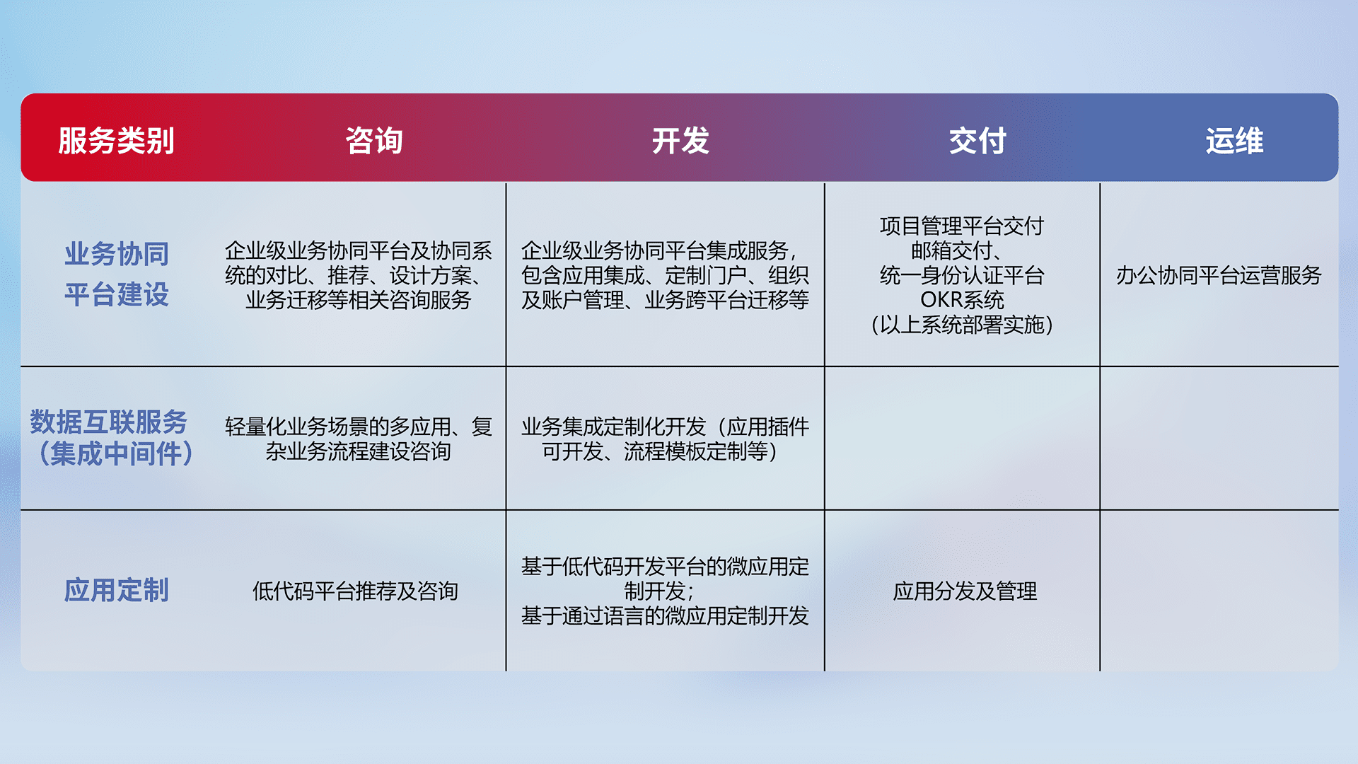 针对钉钉、、、企微、、、、IDaas等平台级产品提供产品的规划、、、、方案、、、交付、、、、定制化开发等服务,,,实现如统一协同办公、、、智能客户服务、、混合会议管理、、、智能数据查询、、、、等业务场景,,实现数字化转型。。